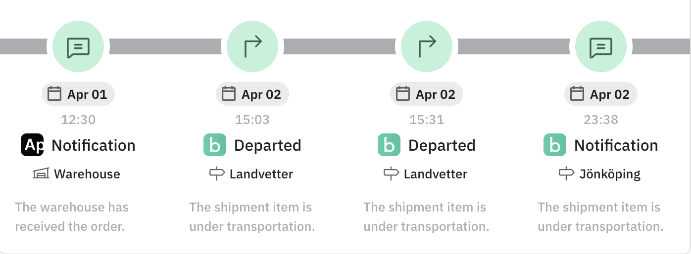 You can easily enhance the tracking experience by adding your own events. This can be particularly useful in scenarios where the shipment is not being actively handled by the transporter, or to show events from another system. Some good examples are: